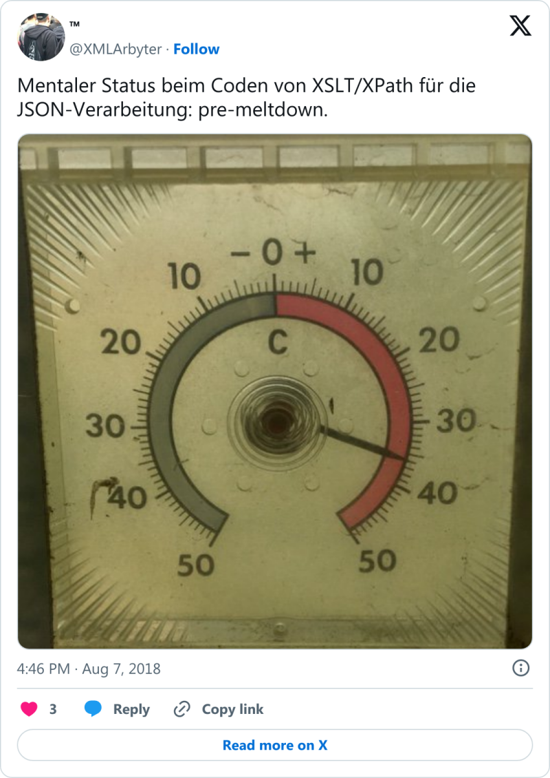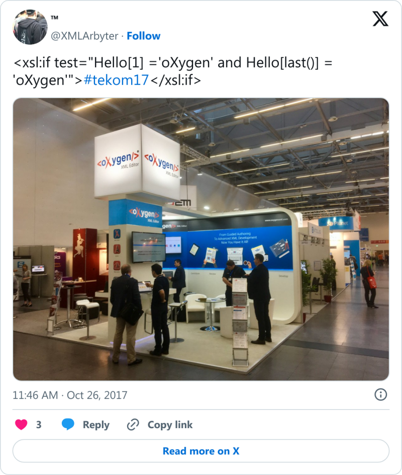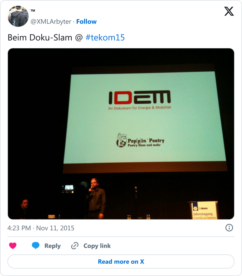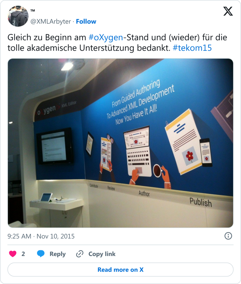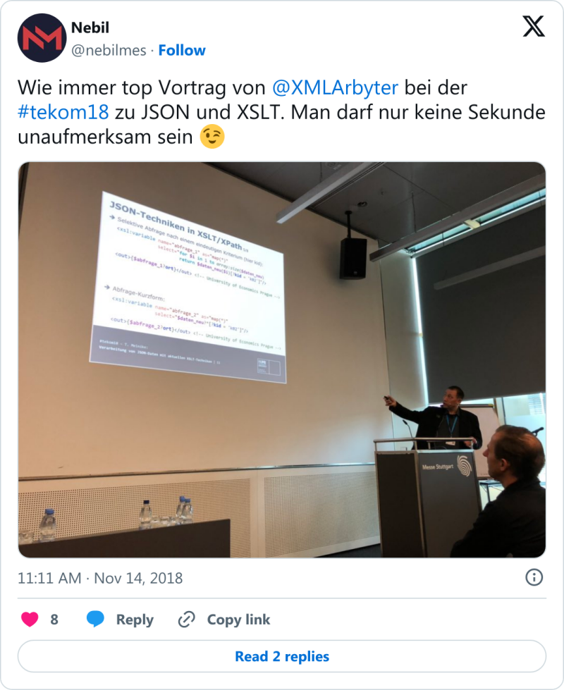 Etwas schwergewichtiger fiel mein Beitrag zur »Verarbeitung von JSON-Daten mit aktuellen XSLT-Techniken« aus. Nach dem Aufzeigen benötigter Grundlagen wurde eine praktische Anwendung demonstriert, welche den öffentlichen Datensatz der in München verfügbaren Parkhäuser verwendet. Darin sind neben allgemeinen Ortsdaten auch die jeweiligen Geokoordinaten enthalten, die sich mit dem freien Kartendienst OpenStreetMap besonders praktikabel visualisieren lassen. Die Resonanz der Teilnehmenden war sehr erfreulich. Besonders der Fachvortrag vor vollem Haus war Lohn genug für die über mehrere Monate verteilte Entwicklungsarbeit. Sämtliche Vortragsmaterialien wie Folien und Code stehen zum Download bereit. Gelegenheit fürs Networking u. a. mit vielen Alumnis unserer Studiengänge sowie Messeausstellern blieb natürlich ebenfalls. Siehe auch diesen Blog-Artikel. <👍/>